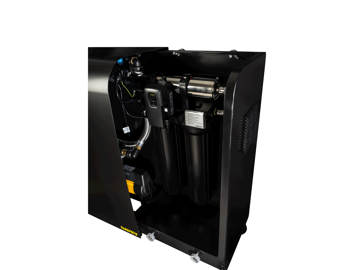 Our UV disinfection system units include a Davey pressure pump, Microlene 20μm (Poly Pleated) filtration for sediment reduction and 1μm (Poly Spun) filtration for cyst reduction and is followed by our trusted Davey Steriflo UV disinfection technology for water safety.